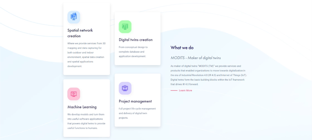 As maker of digital twins “MODITS (TM)” we provide services and products that enabled organizations to move towards digitalization in the era of Industrial Revolution 4.0 (IR 4.0) and Internet of Things (IoT). Digital twins form the basic building blocks within the IoT framework that drives IR 4.0 forward.